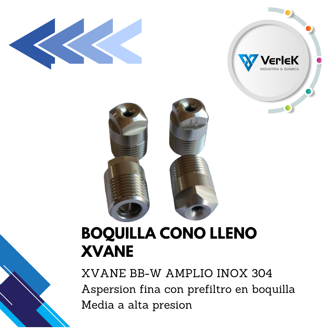 El aspersor XVANE-BB produce un spray de cono lleno de abertura media. Este tipo de aspersor usa un deflector tipo-X (X-vane) interno a la entrada de la tobera. El deflector interno aporta una rotación al fluido que permite una distribución uniforme del fluido durante la aspersión. Son adecuados para uso en torres de absorción. Su construcción en una sola pieza facilita su limpieza.